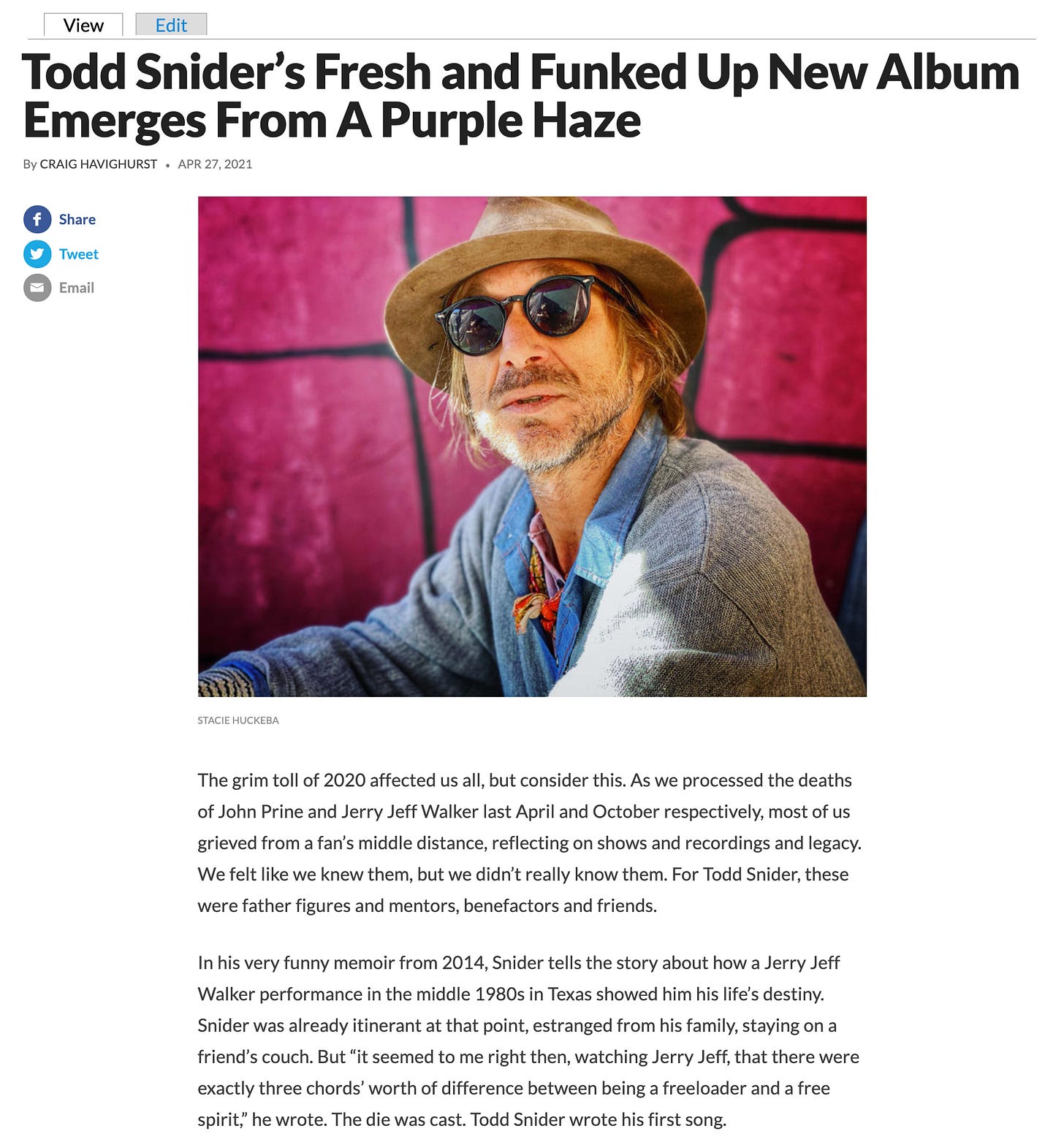 Todd Snider is a remarkable Nashville-based performer and songwriter and an icon of roots Americana music. But he’s tricky because he’s as eccentric as he is smart, and he’s led a life that’s a lot more shambolic and addiction-addled than most of the folks in our community. We had a phone interview a few weeks ago that was fun and interesting but the audio didn’t work for a broadcast. So I drew from the conversation to write a feature review of the new album, trying to capture a paradoxical cat who is beloved by so many in my fold. Click the image for the full feature and let me know about your funniest Todd Snider experiences.