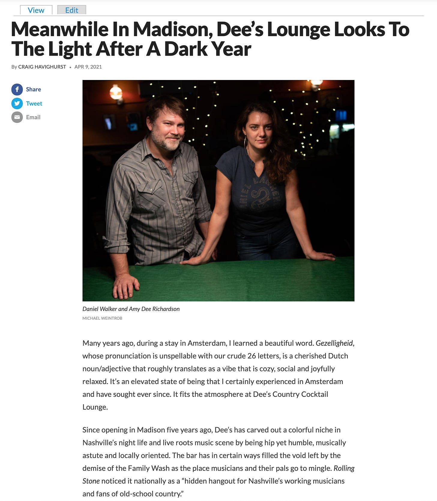 Dee’s Country Cocktail Lounge in Madison, TN is the new hub of East Nashville’s indie roots music community. With tenacity and creativity, owners Amy Dee Richardson and Daniel Walker endured the pandemic to honky tonk again. Click here or on the image to read the piece and hear an outdoor Q&A with them.