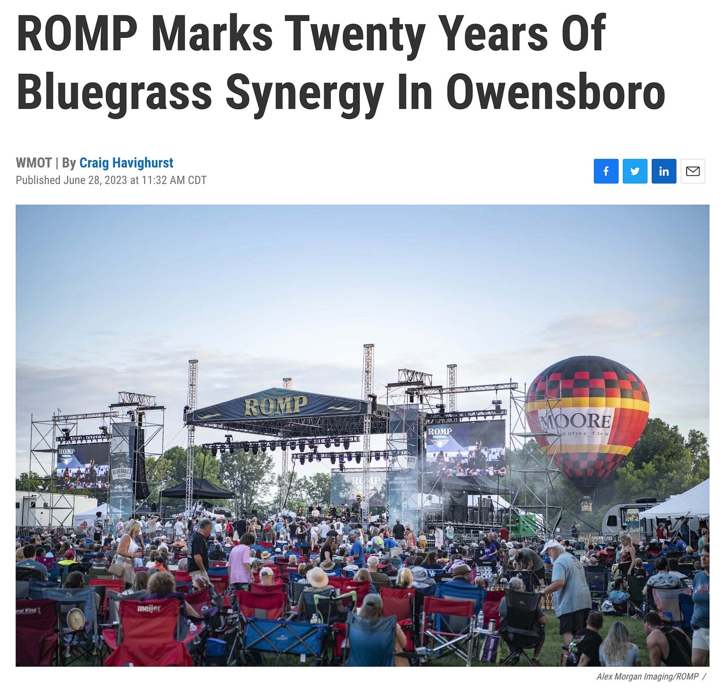 ROMP, nearby in western Kentucky, is one of the most important bluegrass festivals I’d never attended, so when its 20th anniversary came around, I had to attend. I have friends who’ve worked on it over the years, and it lived up to their praises. And it wasn’t even hot. My take for WMOT: